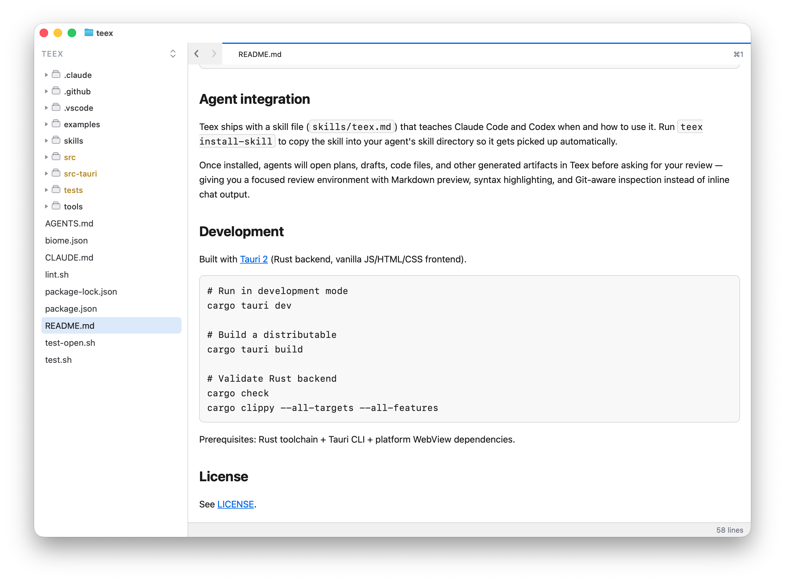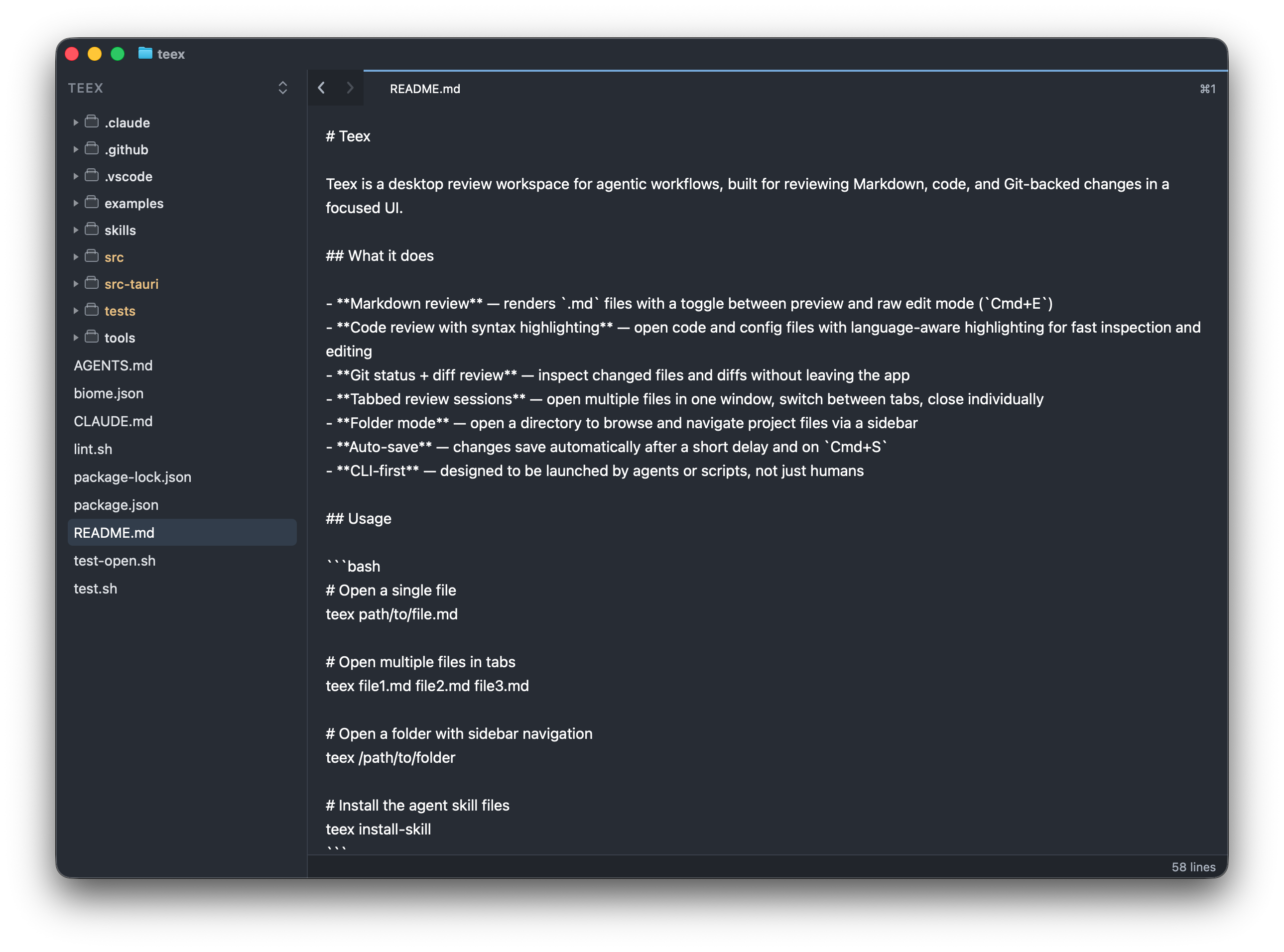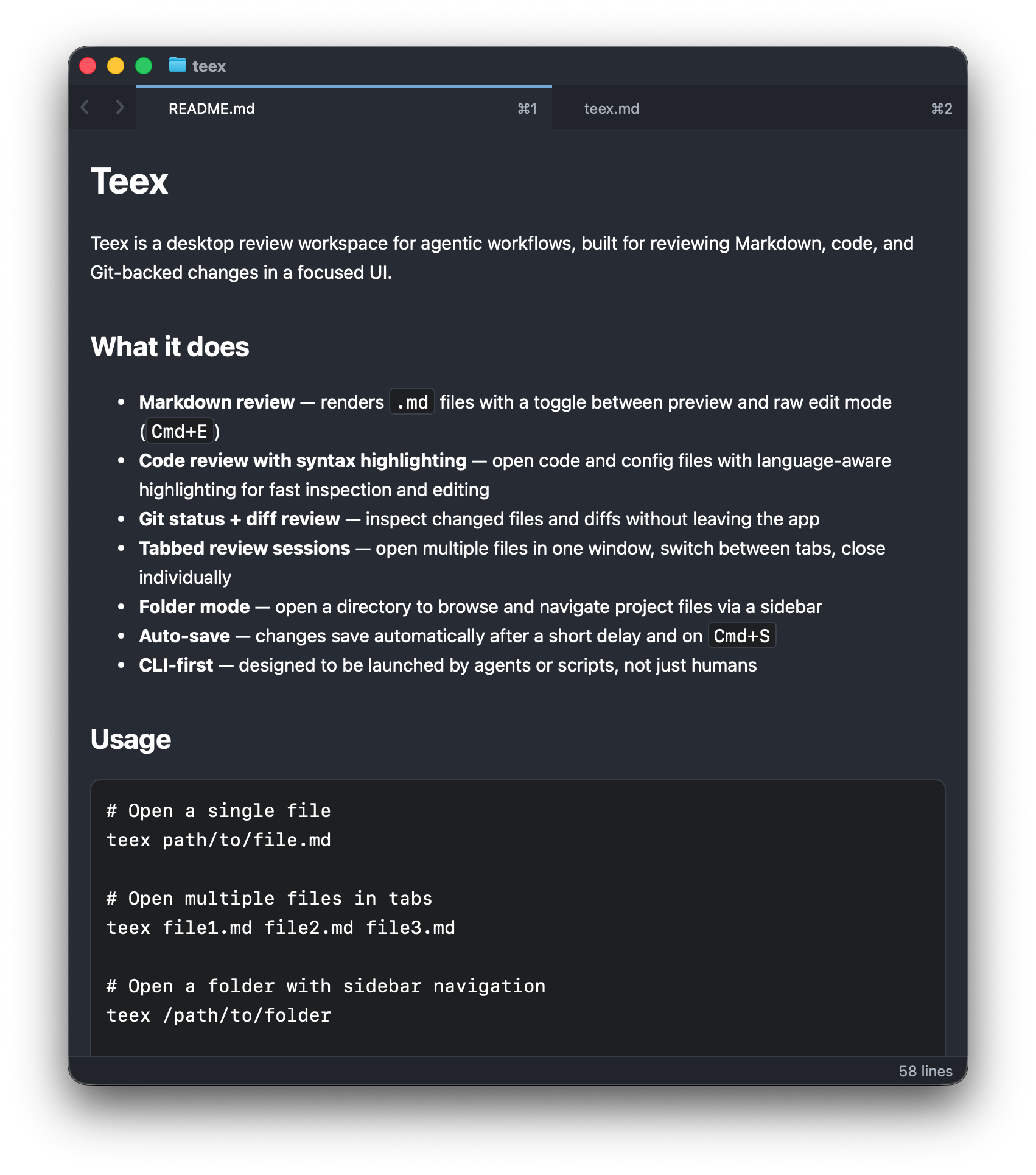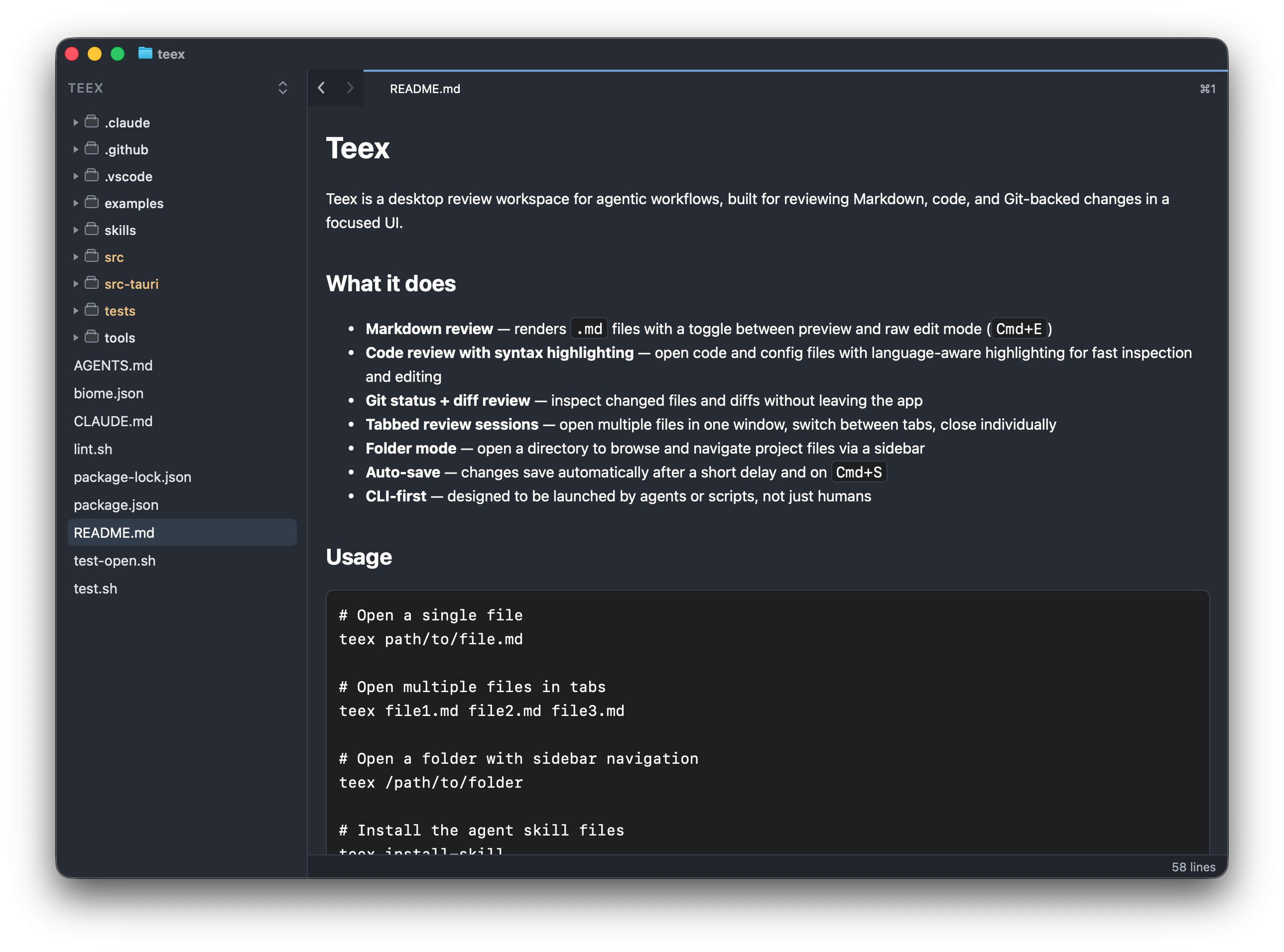 Teex is built for review. Open a file, or let an agent open it for you, and you get the things review actually needs: